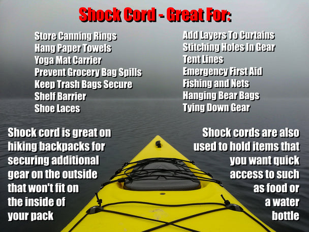 Regular price $ 12.99Most people will think of bungee cord when they feel this shock cord and really, it is very similar. There are many great uses. For instance, banners, tie downs, cargo nets, shoe laces, kayak straps, backpacks,... -