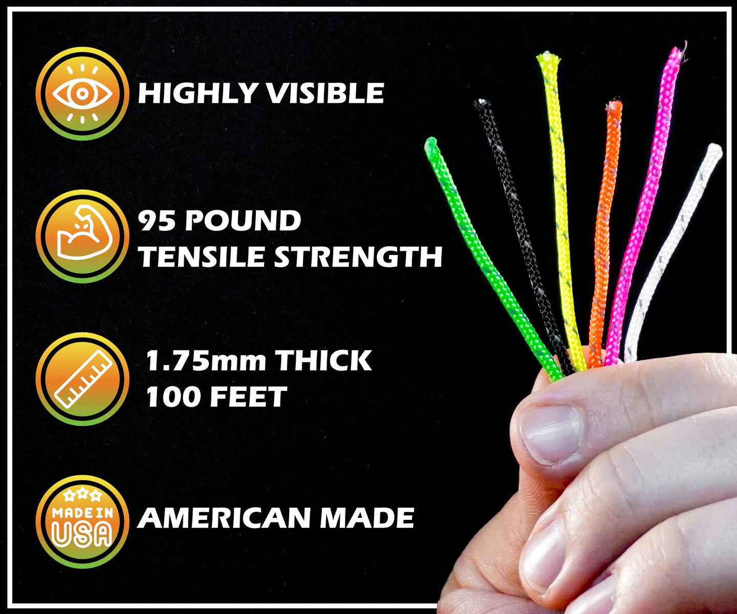 Reflective Fluorescent 95 cord, perfect for emergency situations, outdoor activities, and crafts, especially in low-light conditions. This Type I Nylon Paracord is tough and dependable, with a 1.75mm diameter, 100 LB tensile strength, and 1 inner strand, suitable for various applications. Available in vibrant colors like Neon Pink, Neon Yellow, Neon Orange, White, Black, and Neon Green, the cord ensures high visibility and safety. Each winder contains 100 feet of cord, making it ideal for bracelets, glow parties, camping, festivals, fishing, and more.
