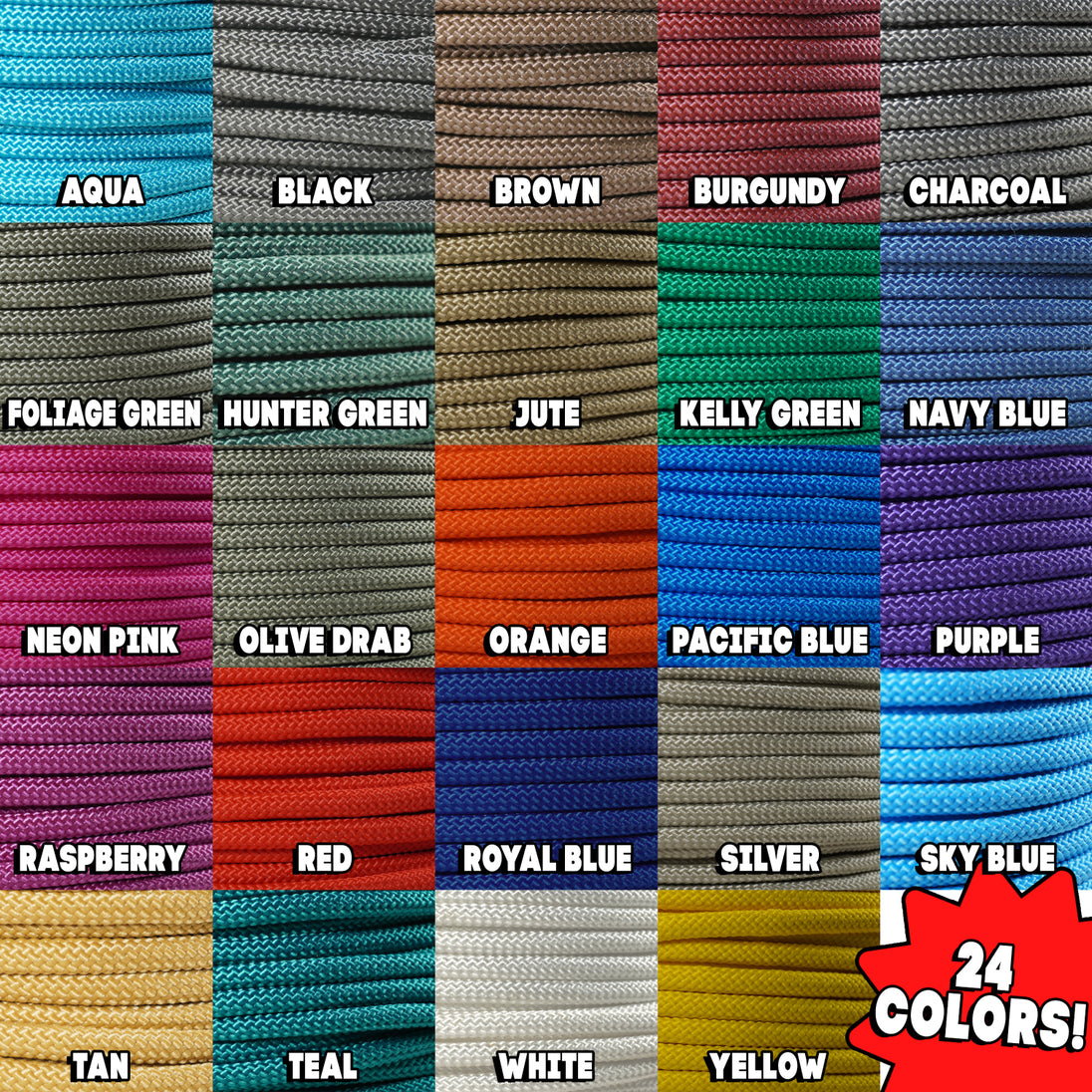 • DIMENSIONS: 1/4" Utility Rope - Choose from 50, 100, or 300 feet. Available in 24 colors: Aqua, Black, Brown, Burgundy, Caribbean Blue, Charcoal, Coyote Brown, Foliage Green, Hunter Green, Kelly Green, Navy Blue, Neon Pink, Olive Drab Green, Orange, Purple, Raspberry, Red, Royal Blue, Silver, Tan, Tarheel Blue, Teal, White, Yellow